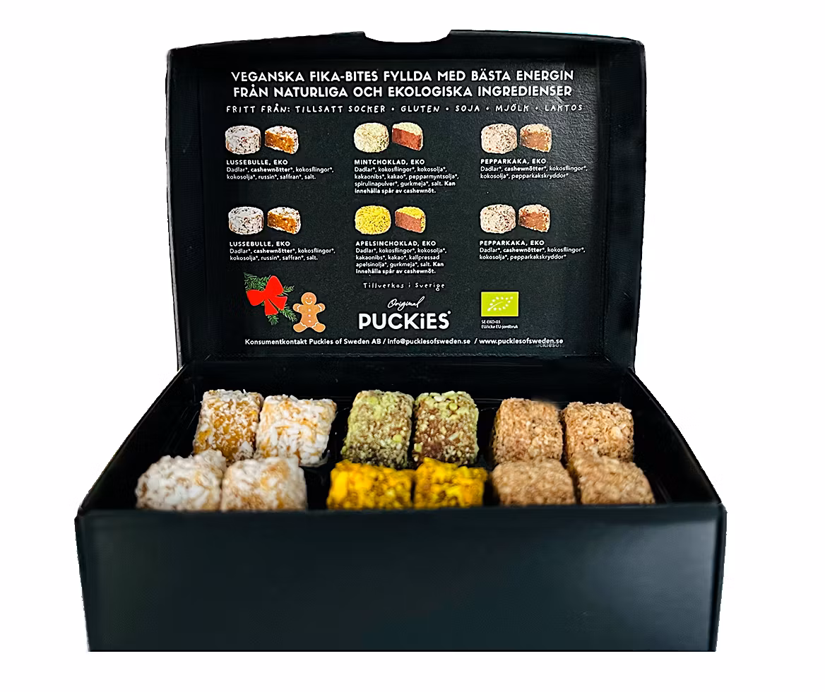Puckies är som alltid,  Veganskt, ekologiskt och tillverkat i Sverige! Med NOLL tillsatser och naturligt fritt från gluten, mjölk, laktos, soja och tillsatt socker, vågar vi lova att du med Puckies, alltid fikar med riktigt gott samvete :-)